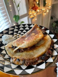 - In a separate skillet, heat a small amount of oil over medium-high heat. Place a tortilla in the skillet and spoon a generous amount of the black bean and chicken filling onto one half of the tortilla. Sprinkle some shredded cheese on top of the filling. Fold the tortilla in half, creating a half-moon shape. Cook until the bottom is golden brown, then flip and cook the other side until golden and crispy. Repeat with the remaining tortillas and filling.