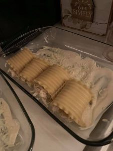 • Arrange the rolled lasagna noodles, seam side down, in the casserole dish.