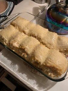 • Carefully roll up the lasagna noodles from the chicken-covered end towards the bare end.
