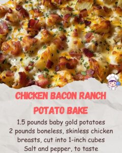 Remove the dish from the oven and uncover. Sprinkle shredded cheese, crumbled bacon, and diced green onion over the chicken and potatoes.