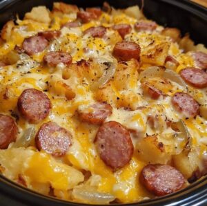In your greased slow cooker, add the frozen hash browns, diced onion, Kielbasa chunks, and cheddar cheese. Toss them together gently to distribute the ingredients evenly.