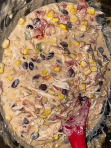 • Once the chicken is fully cooked, use two forks to shred it directly in the crockpot. Stir the chili to incorporate all the ingredients and combine the shredded chicken with the creamy sauce.