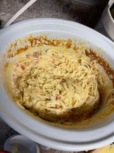- Combine Ingredients: In the crockpot, combine the shredded chicken, butter, cream of chicken soup, chicken broth, cooked spaghetti noodles, cubed cream cheese, cubed Velveeta cheese, and the can of Rotel. Stir well to combine all the ingredients.