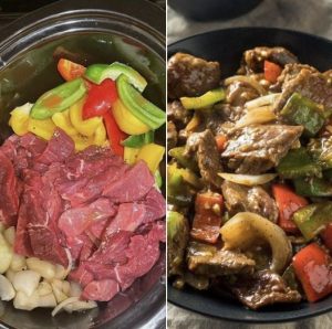 - Layer the Ingredients in the Crockpot: Place the beef strips into the slow cooker. Pour the prepared sauce over the beef. Add the sliced bell peppers, onions, and minced garlic on top of the beef. These colorful and aromatic vegetables will add great flavor and texture to your dish.