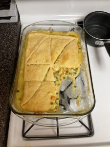 4. Prepare the Topping: While the chicken mixture is baking, open the can of crescent rolls or use the dough sheet. If you’re using crescent rolls, unroll them and pinch the seams together to create one sheet.
