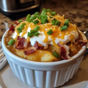 • Season with salt and pepper to taste. Serve hot, garnished with crispy bacon, chopped green onions, and a dollop of sour cream.