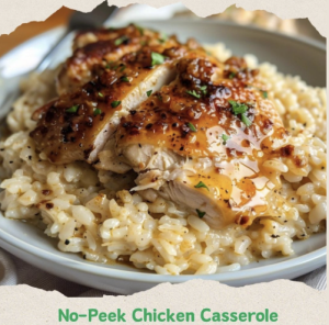 • “No-peek” refers to the method of baking the casserole covered with aluminum foil without opening the oven door to check on it during the cooking process. This helps to trap steam and moisture, allowing the chicken and rice to cook evenly without drying out.