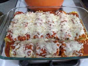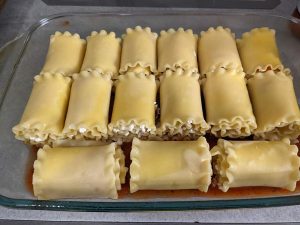 - Place the lasagna roll-ups seam side down in the prepared baking dish.