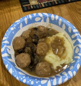 - In a mixing bowl, combine the brown gravy mix with enough beef broth (from the carton) to create a smooth mixture. Pour this gravy mix over the meatballs, mushrooms, and onions in the crockpot.