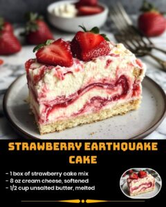 Imagine a dessert that delivers bursts of strawberry sweetness, creamy layers of indulgence, and a delightful crunch with every bite. The Strawberry Earthquake Cake combines the comforting nostalgia of a classic cake with an exciting, “imperfectly perfect” swirl of cream cheese and strawberries. This recipe is as fun to make as it is to eat—ideal for family gatherings, celebrations, or simply treating yourself!